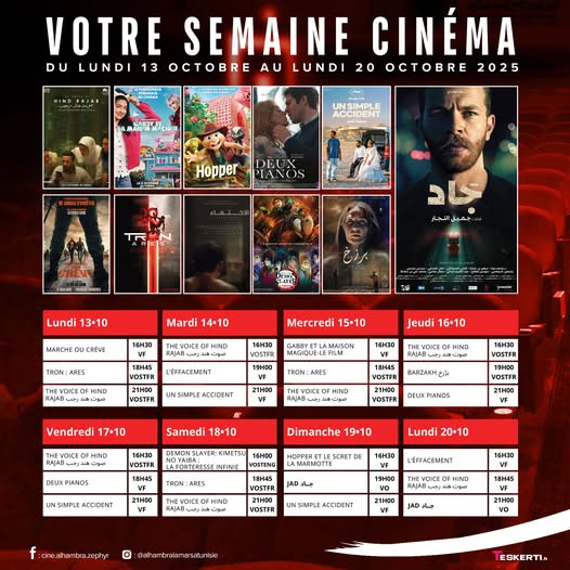 حاليا في قاعات السينما: تقدم سينما L’Alhambra زفير المرسى على ذمة متابعي السينما التونسية والعالمية برنامجا متنوعا إلى غاية 20 أكتوبر 2025.