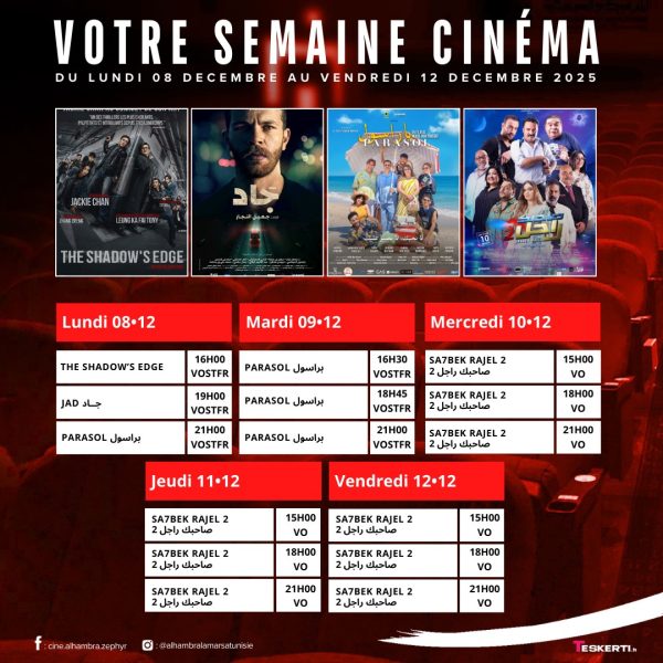 سينما: تضع على ذمة عشاق الفن السابع برنامجا متنوعا إلى غاية 12ديسمبر 2025. قراءة المزيد تقدم سينما L’Alhambra زفير المرسى على ذمة متابعي السينما التونسية والعالمية برنامجا متنوعا إلى غاية 12ديسمبر 2025.سينما البالاص/ أفلام هذا الأسبوع إلى غاية 16 ديسمبر 2025تونس الآن/ النشرة المسائية ليوم الثلاثاء 09 ديسمبر 2025دوري الأبطال/ بايرن ميونيخ يقلب الطاولة على سبورتينغ البرتغاليالمزيد من الأخبار