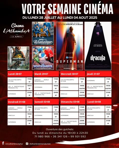 حاليا في قاعات السينما: تقدم سينما L’Alhambra زفير المرسى على ذمة متابعي السينما التونسية والعالمية برنامجا متنوعا إلى غاية 4 أوت 2025