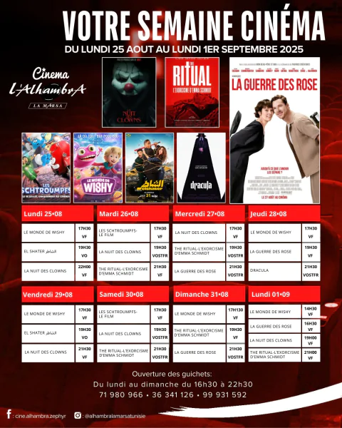 حاليا في قاعات السينما: تقدم سينما L’Alhambra زفير المرسى على ذمة متابعي السينما التونسية والعالمية برنامجا متنوعا إلى غاية 1 سبتمبر 2025.