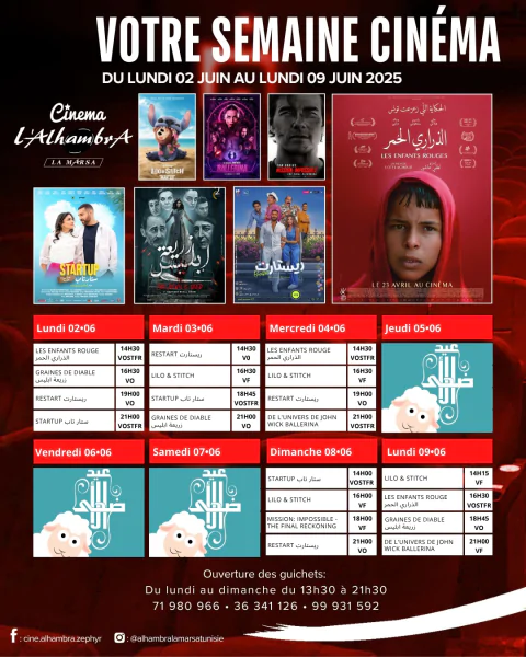 حاليا في قاعات السينما: تقدم سينما L’Alhambra زفير المرسى على ذمة متابعي السينما التونسية والعالمية برنامجا متنوعا إلى غاية 9 جوان 2025