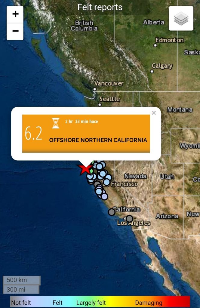 وأوضحت أن الزلزال وقع قبالة الساحل على بعد حوالي 337 كيلومترا شمال غرب سان فرانسيسكو، قبالة بلدة صغيرة تسمى بتروليا والتي يسكنها أقل من 1000 شخص.