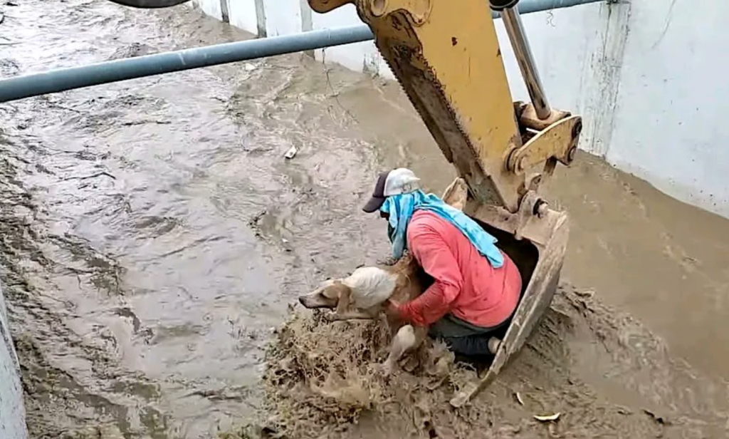 فقد أظهر المقطع الذي صور في مقاطعة بساجي بالإكوادور كلبا علق في سيل مياه جارف، في حين قفز أحد العمال إلى ذراع جرافة كانت بالمكان لمحاولة إنقاذه.