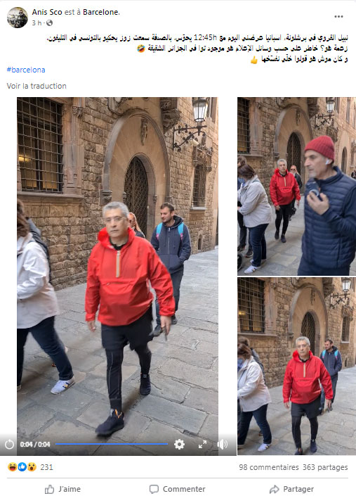 نشر مواطن تونسي متواجد في مدينة برشلونة في إسبانيا، اليوم السبت، صورا ومقطع فيديو على صفحته بموقع التواصل فايسبوك، تظهر رئيس حزب قلب تونس نبيل القروي وشقيقه غازي القروي، يتجولان بشوارع المدينة.