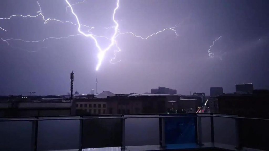 رصدت كاميرا مراقبة في العاصمة الالمانية برلين مشهدا غريبا للحظة ظهور صاعقة برق كبيرة تضربت أعلى برج التلفزيون في برلين دون حدوث أي خسائر، وأظهرت لقطات الفيديو صاعقة برق تضيء سماء العاصمة برلين وسط الظلام، حيث تفرع شعاعها إلى عدة أفرع، في ظاهرة غريبة من نوعها.