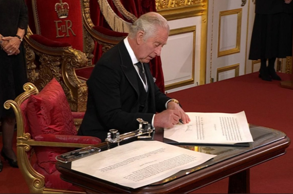 أدى الملك تشارلز الثالث قسم القيام بواجباته أمام مجلس اعتلاء العرش، ثم وقع على وثيقة تنصيبه. ثم قام الأمير وليام ولي العهد بالتوقيع، كما وقعت كاميلا زوجة الملك على الوثيقة.