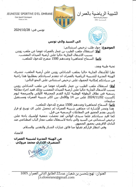 رياضة: راسلت الهيئة المديرة للشبيبة الرياضية بالعمران اليوم الثلاثاء 29 أكتوبر 2024 والي تونس بخصوص مقابلة الفريق السبت القادم ضد مستقبل سليمان ضمن الجواة السابعة من الرابطة المحترفة الأولى قراءة المزيد راسلت الهيئة المديرة للشبيبة الرياضية بالعمران اليوم الثلاثاء 29 أكتوبر 2024 والي تونس بخصوص مقابلة الفريق السبت القادم ضد مستقبل سليمان ضمن الجولة السابعة من الرابطة المحترفة الأولى وتضمنت المراسلة طلبا أولا متمثلا في إستغلال ملعب الطيب بن عمار بالعمران بشكل إستثنائي بعد إنطلاق أشغال صيانة العشب بملعب الشاذلي زويتن.الرابطة الأولى/ مستقبل المرسى يفوز على شبيبة العمرانخطير/ مراسلة برلمانية تدعو رئيس الوزراء الفرنسي ايقاف نشاط نوفلار في أجوائهاالرابطة الأولى/ فوز شبيبة العمران على مستقبل قابسالمزيد من الأخبار كما طلبت شبيبة العمران السماح لـ1500 متفرج بحضور المقابلة من وراء السياج على منوال ما تم السماح به في ملعب مجاز الباب في الجولة الفارطة.