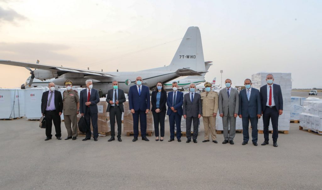 حلّت، مساء اليوم الثلاثاء 13 جويلية 2021 بمطار تونس قرطاج الدولي، طائرتين محمّلتين بــ 250 ألف جرعة من التلاقيح ومعدات طبية متنوّعة لمواجهة جائحة كوفيد-19 ممنوحة من الجمهورية الجزائرية الديمقراطية الشعبية.وتندرج هذه المبادرة في إطار تجسيد ما تمّ الاتفاق بشأنه في المحادثة الهاتفية التي جمعت رئيس الجمهورية قيس سعيّدو الرئيس عبد المجيد تبوّن يوم 12 جويلية 2021، وهي تُترجم مدى متانة وشائج الأخوة وعلاقات التعاون الراسخة بين تونس والجزائر وتُعزّز، أيضا، ايمانهما المشترك بوحدة المصير وبقيم التضامن والتآزر،وقد أعربت مؤسسة رئاسة الجمهورية عن جزيل شكرها وبالغ امتنانها للجزائر الشقيقة قيادة وشعبا على هذا الدعم الأخوي النبيل في ظلّ الظرف الوبائي الدقيق الذي تشهده تونس.وتجدر الإشارة إلى أن عبد الرحمان بن بوزيد، وزير الصحة الجزائري، كان في مقدّمة وفد بلاده الذي أشرف على تسليم هذه التلاقيح والمعدّات تأكيدا على وقوف الجزائر الدائم إلى جانب تونس.كما حضر مراسم التسلّم كلّ من نادية عكاشة، الوزيرة مديرة الديوان الرئاسي، و إبراهيم البرتاجي، وزير الدفاع الوطني، و فوزي المهدي، وزير الصحّة، والفريق طبيب مصطفى الفرجاني، مدير عام الصحة العسكرية، و عزّوز باعلال، سفير الجمهورية الجزائرية الديمقراطية الشعبية بتونس.