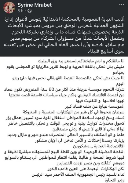 وفق ما اورده نواب بمجلس النواب فان النيابة العمومية بالمحكمة الابتدائية بتونس أذنت لأعوان إدارة الشؤون العدلية للحرس الوطني ببن عروس بمباشرة الأبحاث اللازمة بخصوص شبهات فساد مالي وإداري بشركة اللحوم.