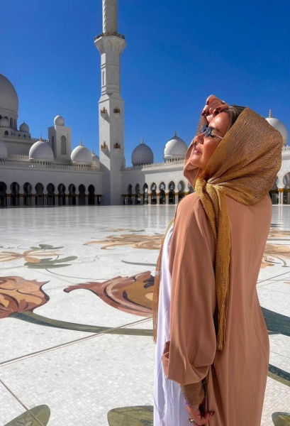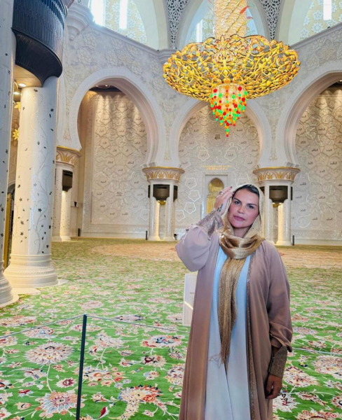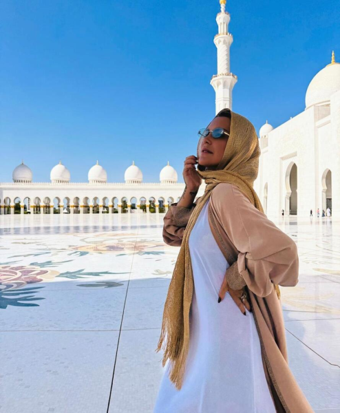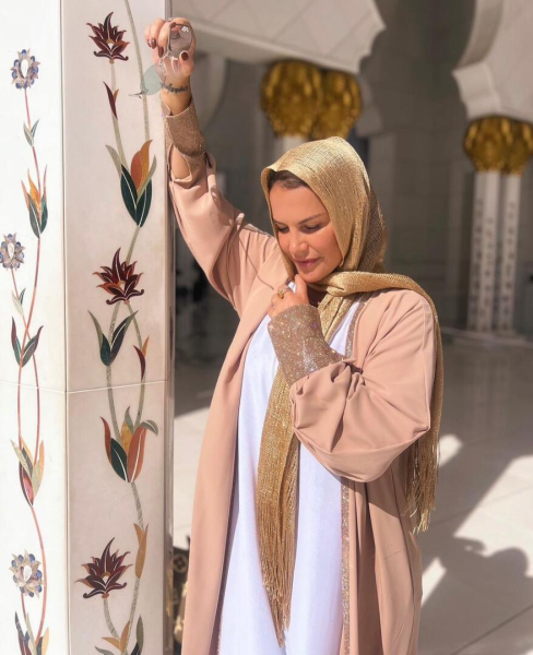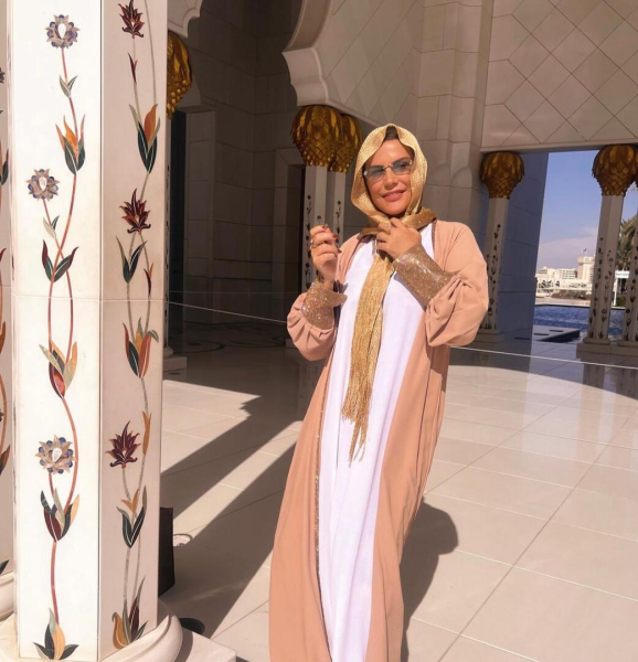 وشاركت، متابعيها عبر حسابها الشخصي على منصة تداول الصور والفيديوهات “إنستغرام”، وهي ترتدي عباءة أثناء تواجدها في ساحة مسجد الشيخ زايد الشهير في مدينة أبو ظبي.