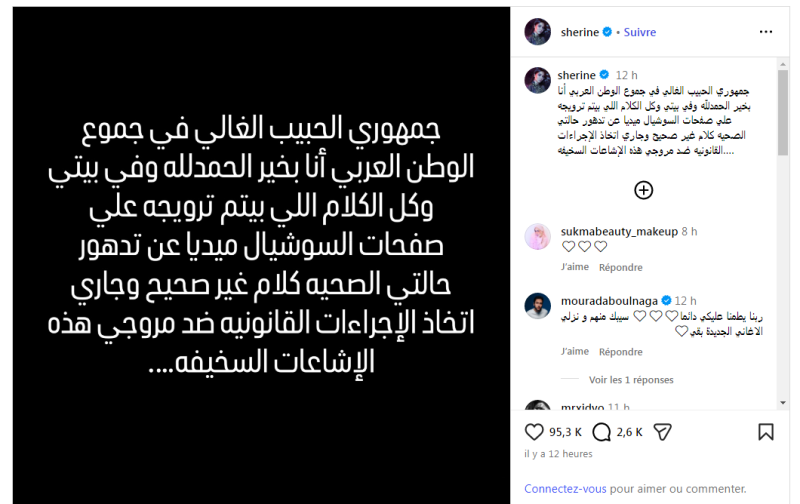 وقالت شيرين، عبر منشور لها على حسابها بموقع “إنستغرام” مساء أمس الثلاثاء 16 ديسمبر 2025 “جمهوري الحبيب الغالي في جموع الوطن العربي أنا بخير الحمد لله وفي منزلي”.. كل ما يروج على مواقع التواصل الاجتماعي عن تدهور حالتي الصحية غير صحيح”.