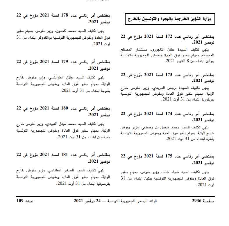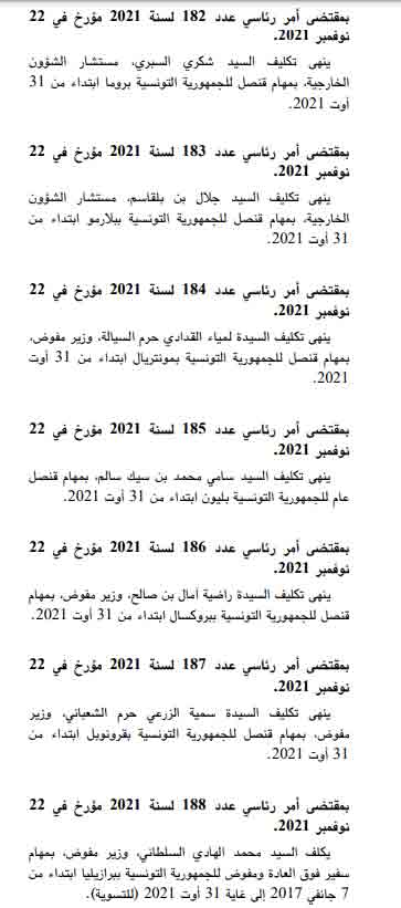 صدر بالرائد الرسمي، اليوم الأربعاء، أوامر رئاسية مؤرخة في 22 […] قراءة المزيد صدر بالرائد الرسمي، اليوم الأربعاء، أوامر رئاسية مؤرخة في 22 نوفمبر 2021 وتقضي بإنهاء مهام سفراء وقناصل ومفوّضين. وفي ما يلي القائمة كاملة:
