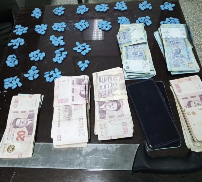 وقد أسفرت العملية عن ضبط المشتبه به رفقة فتاة، وتم حجز 245 قرص مخدر، آلات حادة كبيرة الحجم، ومبلغ مالي يقدر بـ 7 آلاف دينار يُعتقد أنه من عائدات الترويج، بالإضافة إلى حجز دراجة نارية استُعملت في التنقل.