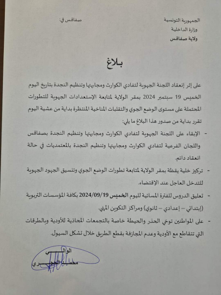 وطنية: أعلنت اللجنة الجهوية لتفادي الكوارث ومجابهتها وتنظيم النجدة بصفاقس عن تعليق الدروس بصفة استثنائية بكافة المؤسسات التربوية والتكوينية