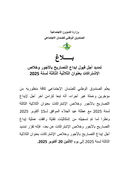 أعلن الصندوق الوطني للضمان الاجتماعي عن تمديد أجل إيداع التصاريح بالأجور وخلاص الاشتراكات الخاصة بالثلاثية الثالثة لسنة 2025 إلى غاية يوم الاثنين 20 أكتوبر 2025.