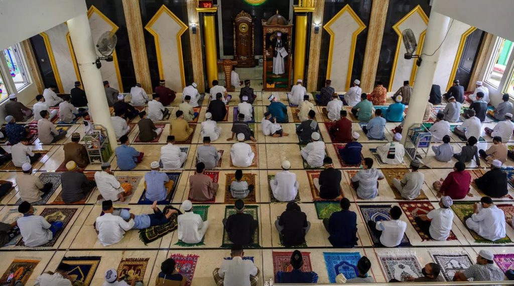 حلت جائحة فيروس كورونا ضيفا ثقيلا على العالم عامة وعلى المسلمين خاصة حيث نغصت عليهم فرحتهم باستقبال أول أيام عيد الفطر الأحد. وتسبب تفشي كوفيد-19 في حرمان العديد من المسلمين من أداء صلاة العيد جماعة وأجبرهم على الاحتفال بالعيد وسط تدابير عزل مشددة، خصوصا بعدما أدى التراخي في الالتزام بالإجراءات الاحترازية خلال شهر رمضان إلى ارتفاع ملحوظ في معدلات الإصابة بالوباء في العديد من الدول العربية والإسلامية وفي هذه الصورة جانب من أحد المساجد في اندونيسيا حيث أدى المصلون اليوم صلاة العيد بتباعد واضح.