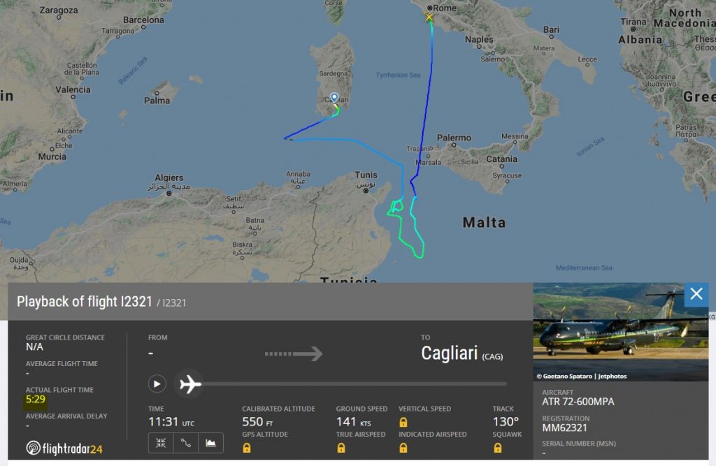 وقد حلَّقت الطائرة طويلا فوق مياهنا الإقليميَّة ومنطقتنا الاقتصاديَّة البحريَّة الحيويَّة الخالصة، وعلى علوٍّ مبرمج منخفض بـ550 قدما (160 مترا) وبعلو فوق سواحلنا في حدود 6000 قَدَم بينما كانت في حدود 25000 قَدَم فوق المياه الإيطاليَّة، وحلَّقت فوق مياهنا في كل الاتِّجاهات في مضيق الرَّأس الطَّيِّب وفي خليج الحمَّامات وخليج المنستير وخليج المهديَّة وجزر قرقنة وخليج قابس ثُمَّ خليج تونس وبنزرت وجزر جالطة وطبرقة ،وزهاء خمسة ساعات كاملة، قبل أن تحطَّ بمطار كالياري ـ إلماس الدُّولي (Cagliari International Airport Elmas (CAG)) جنوب جزيرة سردينيا قبالة السَّواحل الشَّماليَّة التَّونسيَّة، بعد خمسة ساعات ونصف (5:29) من الطَّيران فوق مياهنا أساسا..