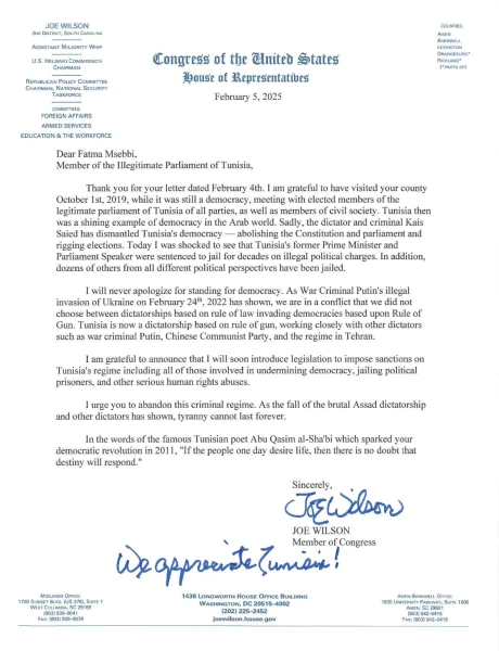 وأضاف ويلسون:” لقد صدمت اليوم عندما رأيت أن رئيس الوزراء السابق ورئيس البرلمان التونسي قد حُكم عليهما بالسجن لعقود بناءً على تهم سياسية غير قانونية. بالإضافة إلى ذلك، تم سجن العشرات من مختلف التوجهات السياسية.”