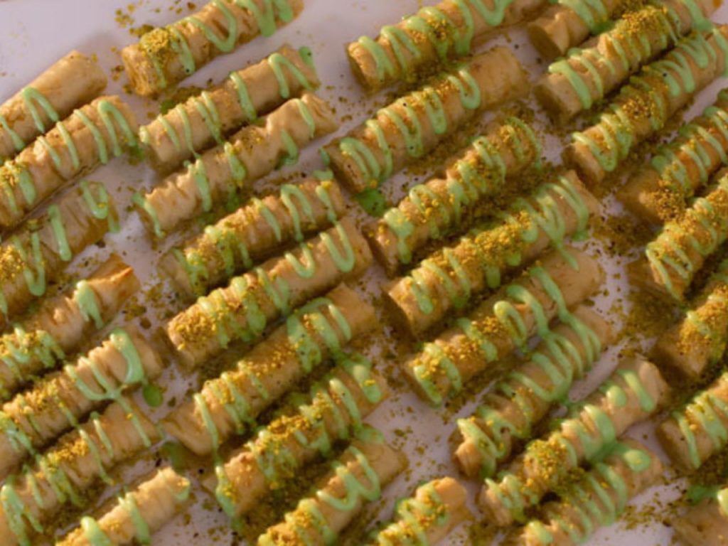 4. وزعي كمية الفستق. لفي طرف الرقاقة الأقصر على الحشو إلى أن تصلي إلى نهاية الرقاقة