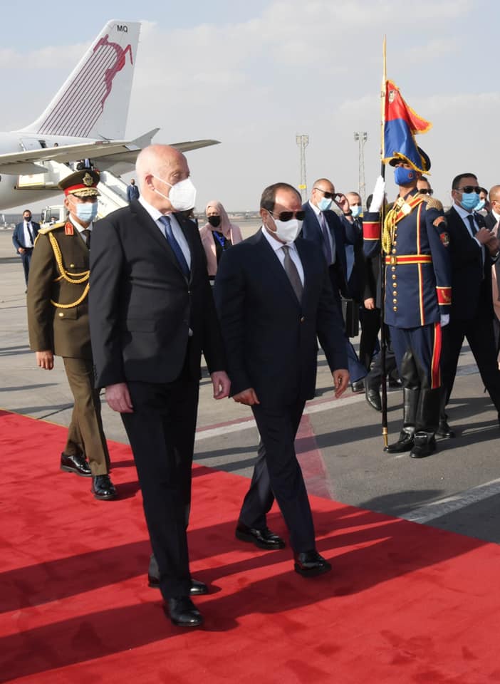 "استقبل السيد الرئيس عبد الفتاح السيسي بعد ظهر اليوم بمطار القاهرة اخيه الرئيس التونسي قيس سعيد الذي يحل ضيفاً عزيزاً علي مصر في زيارة رسمية لمدة ثلاثة ايام".