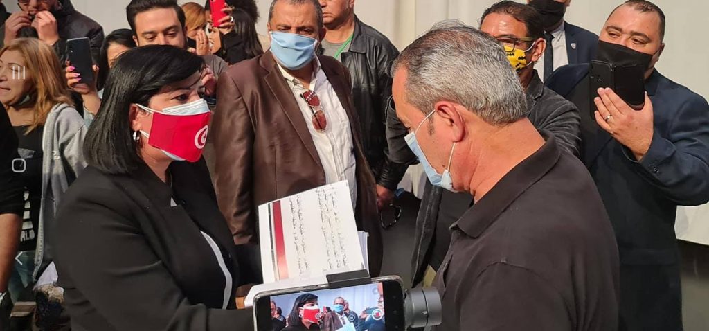 تحولت رئيسة الحزب الدستوري عبير موسي أمس الجمعة 20 نوفمبر 2020 إلى مدينة الثقافة بالعاصمة لمساندة اعتصام الفنانين، حسب نص التدوينة على صفحتها الرسمية.