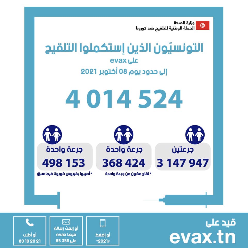 أعلنت وزارة الصحة في بلاغ لها اليوم السبت 9 أكتوبر 2021 عن ارتفاع عدد التونسيين الذين استكملوا التلقيح ضد فيروس كورونا الى حدود يوم 8 أكتوبر 2021 الى 4014524 شخصا.