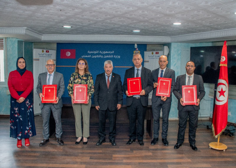 في إطار تنفيذ التوصيات المنبثقة عن جلسة العمل المنتظمة يوم الاثنين 14 أكتوبر 2024 لمتابعة تنفيذ برنامج دعم المشاريع المؤسسات الصغرى المتعثرة، أعلن رياض شــــوّد وزير التشغيل والتكوين المهني يوم الأربعاء 16 أكتوبر 2024 بمقر الوزارة عن إنطلاق المرحلة النهائية للبرنامج وإمضاء المذكرة التنظيمية المشتركة. وتم توقيع المذكرة بين الوكالة الوطنية للتشغيل والعمل المستقل والبنك التونسي للتضامن ووكالة النهوض بالاستثمارات الفلاحية والديوان الوطني للصناعات التقليدية ووكالة النهوض بالصناعة والتجديد بحضور السيدة جيهان قازة رئيسة الديوان وعدد هام من إطارات الوزارة وهياكل المرافقة والمساندة المعنية.