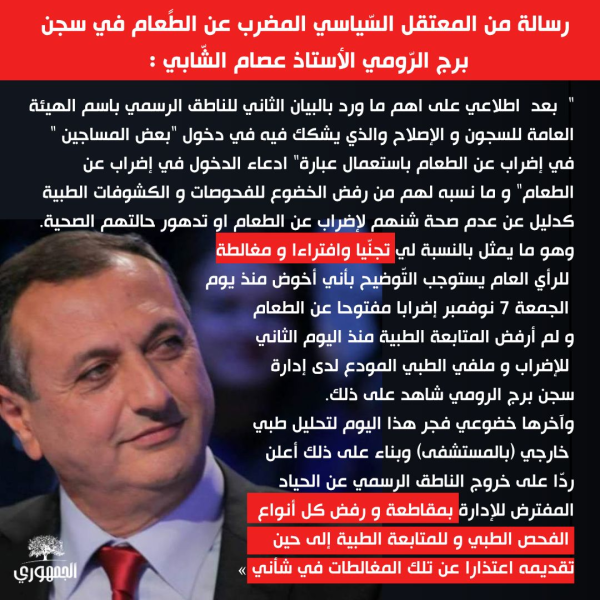 وجاء في رسالة الشابي قوله ” بعد اطلاعي على اهم ما ورد بالبيان الثاني للناطق الرسمي باسم الهيئة العامة للسجون و الإصلاح والذي يشكك فيه في دخول “بعض المساجين ” في إضراب عن الطعام باستعمال عبارة” ادعاء الدخول في إضراب عن الطعام” و ما نسبه لهم من رفض الخضوع للفحوصات و الكشوفات الطبية كدليل عن عدم صحة شنهم لإضراب عن الطعام او تدهور حالتهم الصحية”. واضاف : “وهو ما يمثل بالنسبة لي تجنّيا وافتراءا و مغالطة للرأي العام يستوجب التّوضيح بأني أخوض منذ يوم الجمعة 7 نوفمبر إضرابا مفتوحا عن الطعام و لم أرفض المتابعة الطبية منذ اليوم الثاني للإضراب و ملفي الطبي المودع لدى إدارة سجن برج الرومي شاهد على ذلك وآخرها خضوعي فجر هذا اليوم لتحليل طبي خارجي (بالمستشفى) وبناء على ذلك أعلن ردّا على خروج الناطق الرسمي عن الحياد المفترض للإدارة بمقاطعة و رفض كل أنواع الفحص الطبي و للمتابعة الطبية إلى حين تقديمه اعتذارا عن تلك المغالطات في شأني »