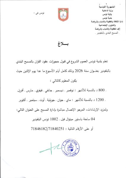 أعلنت بلدية تونس عن فتح باب قبول حجوزات عقود القران في المسبح البلدي بالبلفيدير لسنة 2026. وأوضحت البلدية في بلاغ رسمي أن الحجوزات متاحة طوال أيام الأسبوع، عدا يوم الاثنين، مع تحديد معلوم الحجز كما يلي: