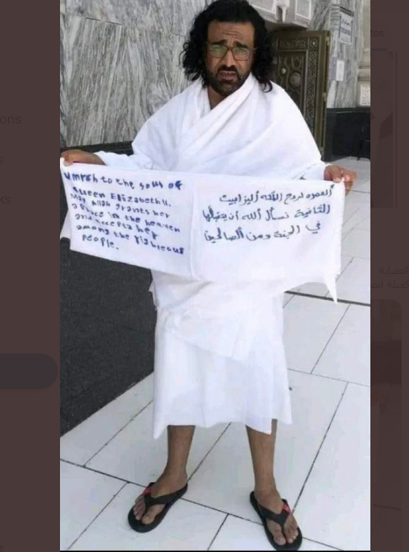 وانتشر مقطع فيديو يُظهر معتمرًا يرفع لافتة كُتب عليها: “عمرة عن روح الملكة إليزابيث الثانية، نسأل الله أن يتقبلها في الجنة ومع الصالحين”.