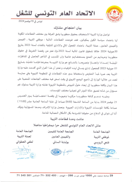 ويأتي هذا التحرك الاحتجاجي، للتعبير عن رفضهم لاعتماد وزارة التربية تاريخ 30 جويلية 2024 كمفعول مالي وإداري للترقية بالملفات لسنة 2023 خلافا لمنطوق قانون المالية لسنة 2023، حسب نص البيان.