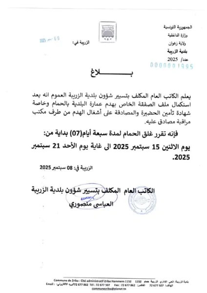 وطنية: أعلنت بلدية الزريبة بولاية زغوان عن غلق حمام الزريبة مؤقتًا لمدة أسبوع، ابتداءً من يوم الاثنين 15 سبتمبر وحتى يوم الأحد 21 سبتمبر. قراءة المزيد أعلنت بلدية الزريبة بولاية زغوان عن غلق حمام الزريبة مؤقتًا لمدة أسبوع، ابتداءً من يوم الاثنين 15 سبتمبر وحتى يوم الأحد 21 سبتمبر. ويأتي هذا الإجراء بسبب أعمال هدم عمارة مهددة بالانهيار تقع بجوار الحمام.زغوان.. نثر 5500 دعسوقة لمقاومة الحشرة القرمزيةزغوان.. إعادة فتح مكتب بريد الفحصزغوان.. مندوبية الفلاحة تحذرالمزيد من الأخبار