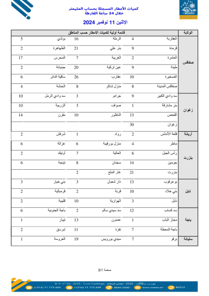 كشف المعهد الوطني للرصد الجوي عنالقائمة الأولية لكميات الأمطار المسجلة بحساب المليمتر خلال الـ 24 ساعة الفارطة من الساعة السابعة من صباح أمس الأحد 10 نوفمبر 20 24 إلى غاية الساعة السابعة من صباح اليوم الإثنين 11 نوفمبر 2024. وبلغت أعلى الكميات 42 مليمتر تم تسجيها في بئر الحفي وسيدي بوزيد من ولاية سيدي بوزيد، ثم 30 مليمتر سجلت في زغوان وفيما يلي بقية الكميات المسجلة.
