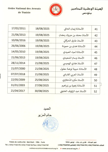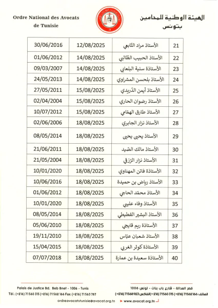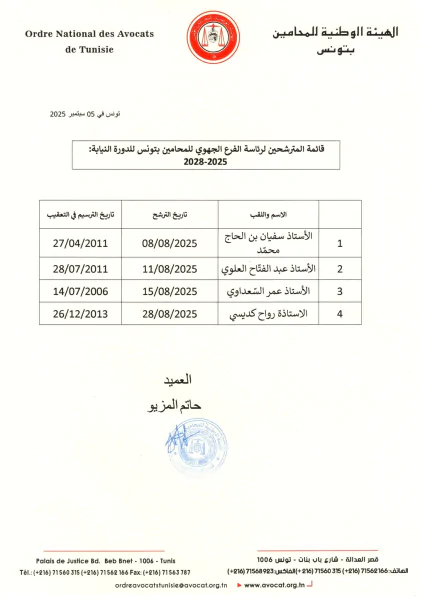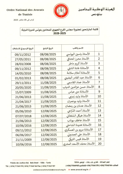 وطنية: نشرت الهيئة الوطنية للمحامين قائمة المترشحين لرئاسة و عضوية مجلس الفرع الجهوي للمحامين بتونس للدورة النيابة: 2025-2028