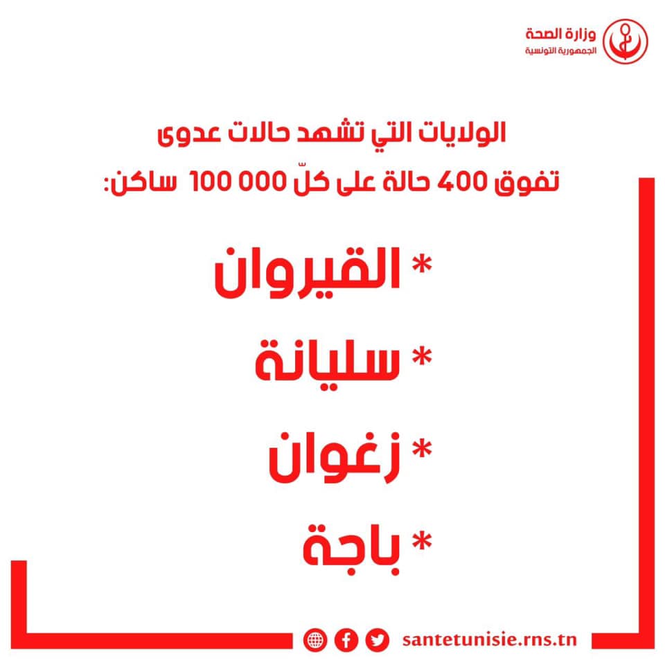 نشرت وزارة الصحة، اليوم السبت قائمة المعتمديات التي تشهد معدل انتشار عدوى مرتفعا جدّا: