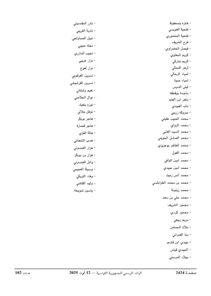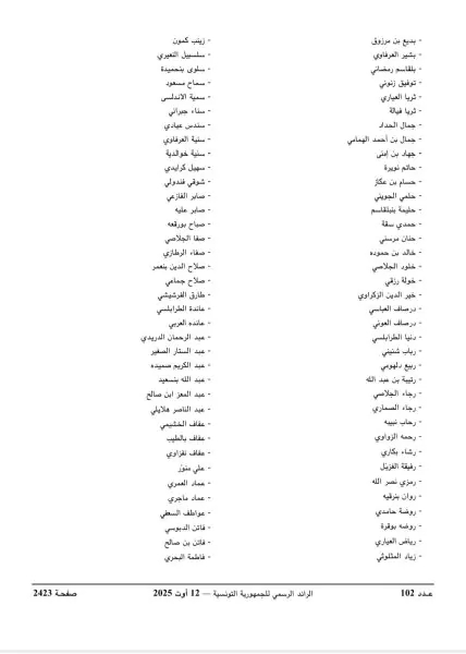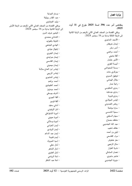 صدر بالرائد الرسمي للجمهورية التونسية بمقتضى أمر عدد 396 لسنة 2025 مؤرخ في 11 أوت 2025، ترقية قضاة من الصنف العدلي من الرتبة الثانية الى الرتبة الثالثة.