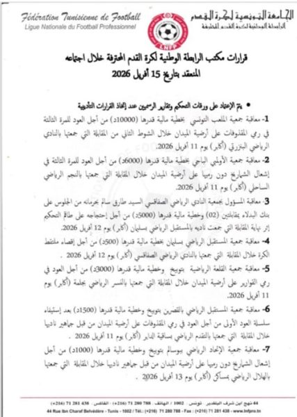 رياضة: تسليط عقوبة على مسؤول النادي الصفاقسي طارق سالم تقضي بمنعه من الجلوس على بنك البدلاء لمقابلتين.