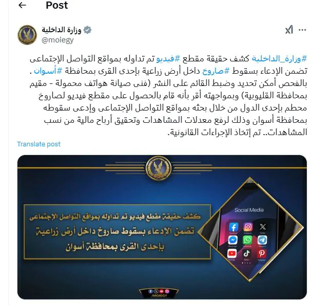 إلى ذلك، بينت أنه أقر بالحصول على مقطع فيديو لصاروخ محطم بإحدى الدول من خلال بحثه عبر مواقع التواصل الاجتماعي، ثم ادعى سقوطه بمحافظة أسوان، لرفع معدلات المشاهدات وحصد “اللايكات” وتحقيق أرباح مالية!