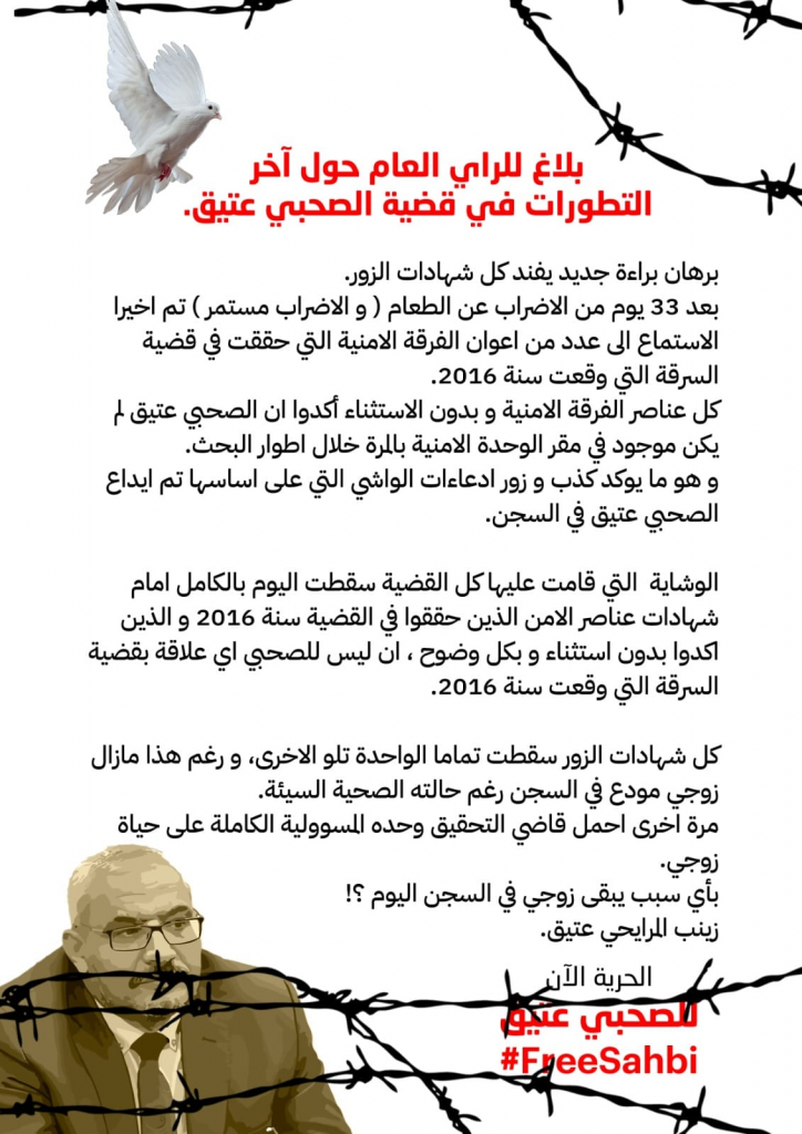 واضافت “كل عناصر الفرقة الامنية أكدوا دون استثناء ان الصحبي عتيق لم يكن موجودا بمقر الوحدة الامنية بالمرة خلال اطوار البحث وانه لا علاقة له بقضية السرقة وهو ما يؤكد كذب وزور ادعاءات الواشي التي تم على ضوئها ايداع زوجي السجن…الوشاية التي بنيت عليها القضية سقطت اليوم بالكامل بعد شهادات عناصر الامن الذين حققوا في القضة سنة 2016 …كل شهادات الزور سقطت الواحدة تلو الاخرى ورغم ذلك مازال زوجي مودعا بالسجن رغم حالته الصحية السيئة”.