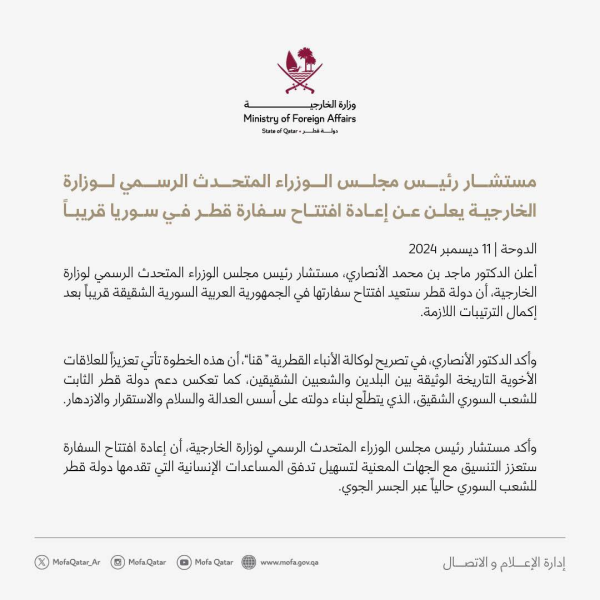 عالمية: قالت وزارة الخارجية القطرية ان الدوحة ستعيد قريبا فتح سفارتها في سوريا بعد إكمال الترتيبات اللازمة