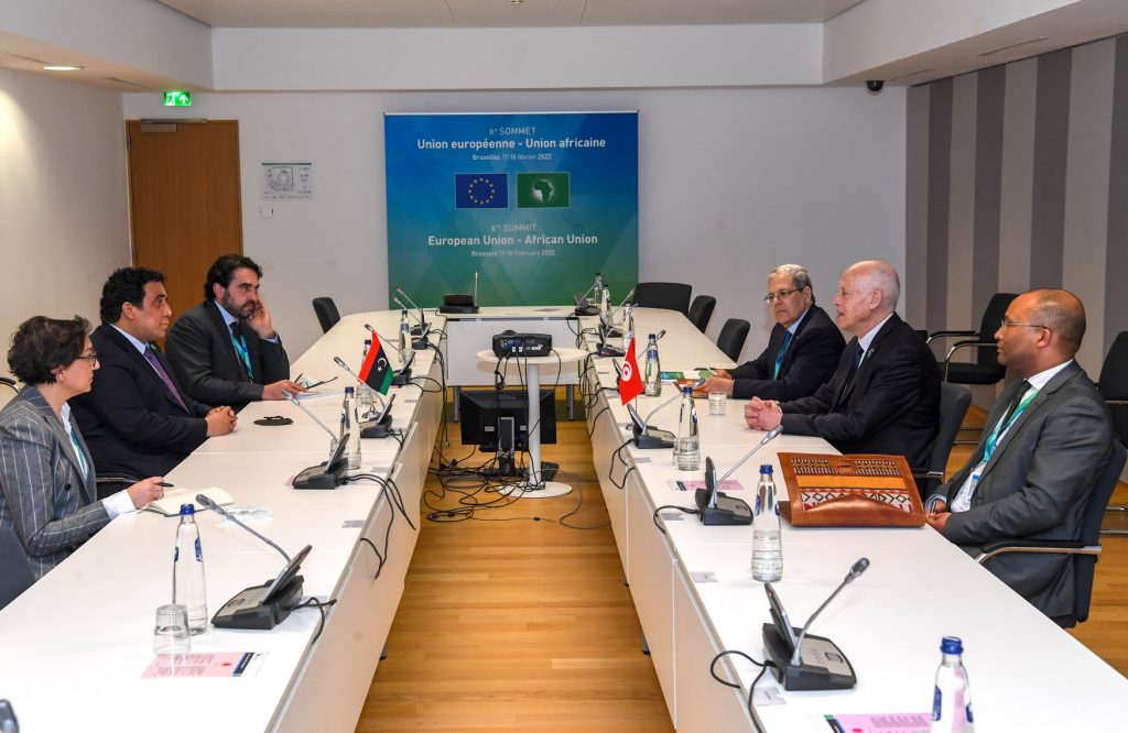 أجرى رئيس الجمهورية قيس سعيد، ظهر اليوم الجمعة ببروكسيل، محادثة مع محمد المنفي، رئيس المجلس الرئاسي الليبي.
