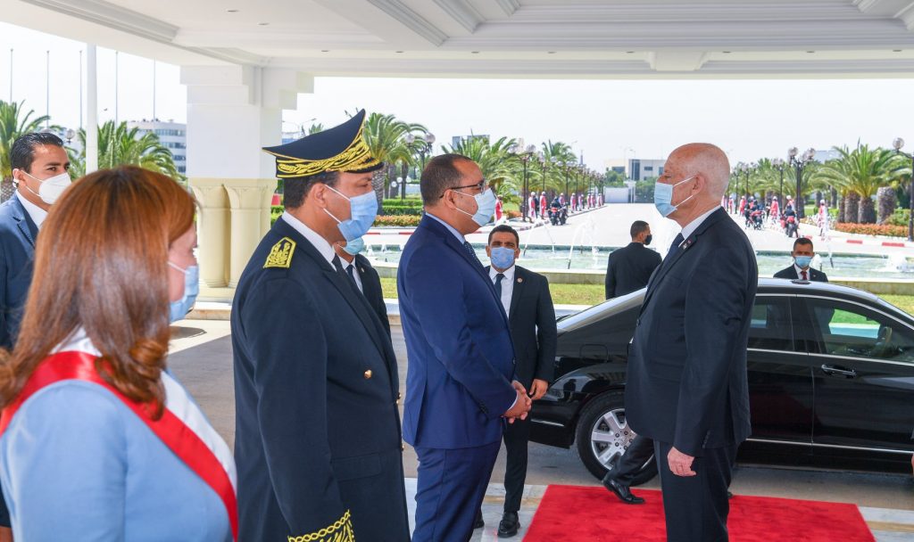 ولدى حلوله بمطار تونس قرطاج الدولي، استعرض رئيس الجمهورية تشكيلة من الجيوش الثلاثة أدت له التحية، قبل تحية العلم على أنغام النشيد الوطني.