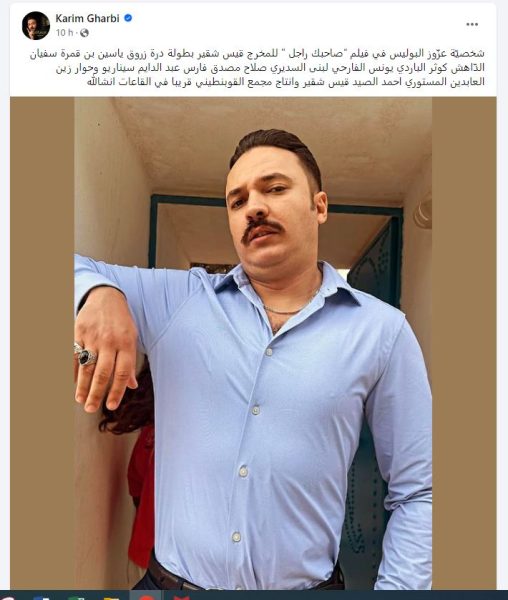 ثقافة: كشف الممثل كريم الغربي، عن تفاصيل عمل جديد يُعرض قريبا في قاعات السينما التونسية . قراءة المزيد كشف الممثل كريم الغربي، عن تفاصيل عمل جديد يُعرض قريبا في قاعات السينما التونسية . وسيؤدي “الغربي” وفق تدوينة نشرها على صفحته الرسمية، شخصيّة “عزّوز البوليس” في فيلم “صاحبك راجل” للمخرج قيس شقير. وسيكون الفيلم من بطولة دُرّة زروق وياسين بن قمرة وسفيان الدّاهش وكوثر الباردي ويونس الفارحي ولبنى السديري وصلاح مصدق وفارس عبد الدايم. واشار، إلى أنّ السيناريو والحوار لزين العابدين المستوري وأحمد الصيد وقيس شقير ومن إنتاج “مجمع القوبنطيني”، مضيفا أنّه سيتّم عرض العمل الجديد قريبا في قاعات السينما.