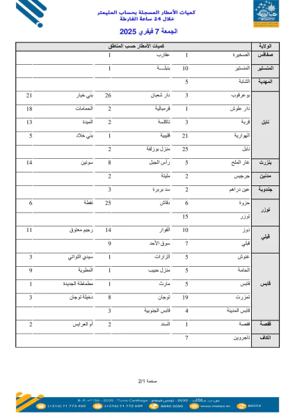 نشر المعهد الوطني للرصد الجوي قائمة لكميات الأمطار المسجلة خلال 24 ساعة الفارطة(من الساعة 07:00 ليوم الخميس 06 إلى الساعة 07:00 ليوم الجمعة 07 فيفري 2025):
