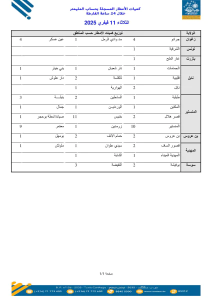 وطنية: نشر المعهد الوطني للرصد الجوي قائمة لكميات الأمطار المسجلة خلال 24 ساعة الفارطة قراءة المزيد نشر المعهد الوطني للرصد الجوي قائمة لكميات الأمطار المسجلة خلال 24 ساعة الفارطة (من الساعة 07:00 ليوم الاثنين 10 إلى الساعة 07:00 ليوم الثلاثاء 11 فيفري 2025):طقس ليل 04 ديسمبر 2025.. أمطار مع تساقط للبردطقس ليل 02 ديسمبر 2025.. أمطار وضباب يهذه المناطقطقس ليل 29 نوفمبر 2025.. أمطار ورياح قوية بالسواحلالمزيد من الأخبار
