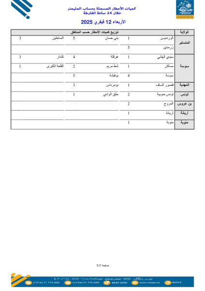 وطنية: نشر المعهد الوطني للرصد الجوي قائمة لكميات الأمطار المسجلة خلال 24 ساعة الفارطة قراءة المزيد نشر المعهد الوطني للرصد الجوي قائمة لكميات الأمطار المسجلة خلال 24 ساعة الفارطة (من الساعة 07:00 ليوم الثلاثاء 11 إلى الساعة 07:00 ليوم الأربعاء 12فيفري 2025): أعلاها في عين دراهم كميات أمطار يوم 28 نوفمبركميات أمطار يوم 21 نوفمبر 2025أعلاها في جربة.. كميات أمطار يوم 20 نوفمبر 2025المزيد من الأخبار