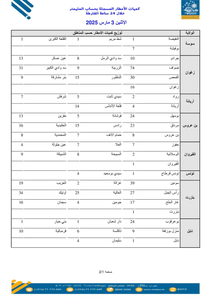 نشر المعهد الوطني للرصد الجوي اليوم الاثنين 3 مارس 2025 ، قائمة أوّلية لكميات الأمطار المسجلة خلال 24 ساعة الفارطة (من الساعة 07:00 ليوم الأحد 02 إلى الساعة 07:00 ليوم الاثنين 03 مارس 2025) :
