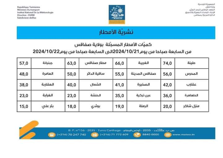 وطنية: سجلت أغلب معتمديات ولاية صفاقس خلال ال 24 ساعة الماضية، هطول كميات من الأمطار، كانت أعلاها في طينة ب 74 ميلميترا