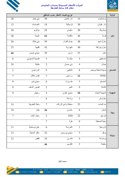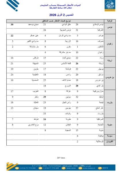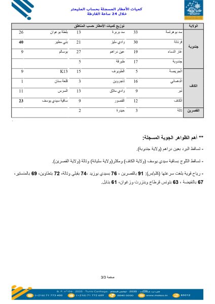 وطنية: كميات هامة من الأمطار في مناطق متفرقة من البلاد. قراءة المزيد نشر المعهد الوطني للرصد الجوي في بلاغ على صفحته الرسمية على فيسبوك قائمة لكميات الأمطار المسجلة على كامل تراب الجمهورية خلال الـ24 ساعة الفارطة وهي على النحو التالي:توقف حركة بطاحات جربةتصفيات كان U17/ المنتخب يواجه اليوم نظيره الجزائريترامب يُربك الأسواق.. النفط والدولار يقفزان والذهب يتراجعالمزيد من الأخبار