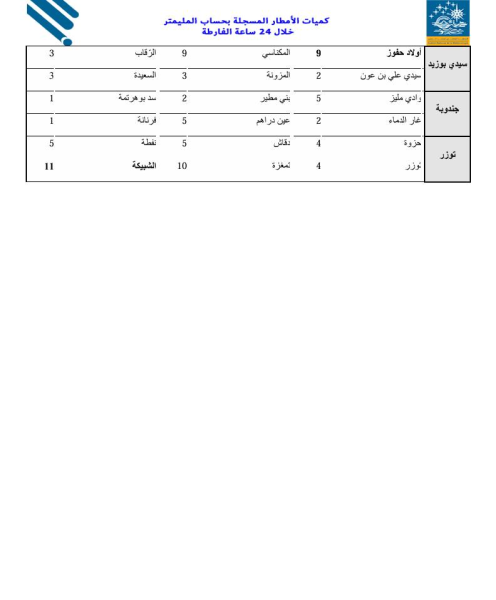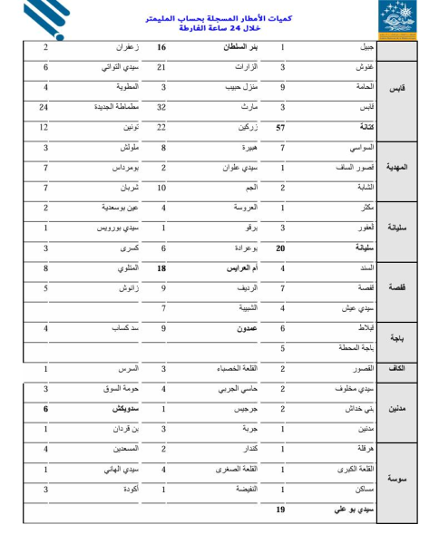 وطنية: نشر المعهد الوطني للرصد الجوي القائمة الاولية لكميات الأمطار المسجلة بحساب المليمتر خلال 24 ساعة الفارطة قراءة المزيد نشر المعهد الوطني للرصد الجوي القائمة الاولية لكميات الأمطار المسجلة بحساب المليمتر خلال 24 ساعة الفارطة من الساعة07:00 ليوم 19 سبتمبر إلى غاية الساعة 07:00 ليوم 20 سبتمبر 2024 :كميات الأمطار المسجلة يوم 9 نوفمبر 2025كميات الأمطار المسجلة يوم 2 نوفمبر 2025كميات الأمطار المسجلة يوم 19 أكتوبر 2025المزيد من الأخبار